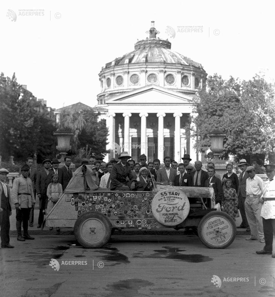 Automobil Ford din prima generaţie, sosit dintr-un tur prin 55 de ţări, ce a durat 12 ani, întâmpinat în faţa Ateneului Român.