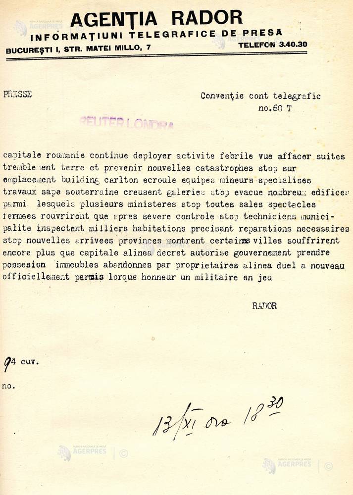 Telegrama RADOR/AGERPRES cu ştiri despre cutremurul din 1940