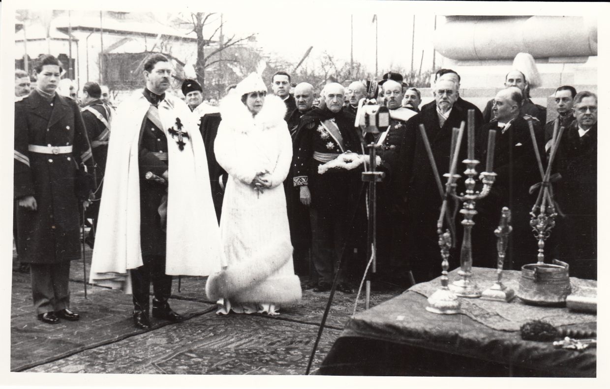 Regele Carol al II-lea, Regina Maria şi Marele Voievod de Alba Iulia, Mihai, la inaugurarea Arcului de Triumf din Capitală, la 1 decembrie 1936.