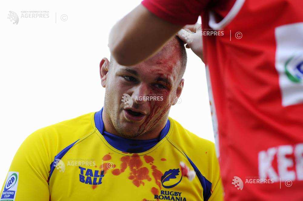 Alexandru Ţăruş primeşte îngrijiri medicale în timpul meciului dintre România (echipament galben/albastru) şi Argentina Jaguars (echipament bleu/alb), în cadrul turneului de rugby IRB Nations Cup 2013, organizat pe Stadionul ”Arcul de Triumf” din Bucureşti.