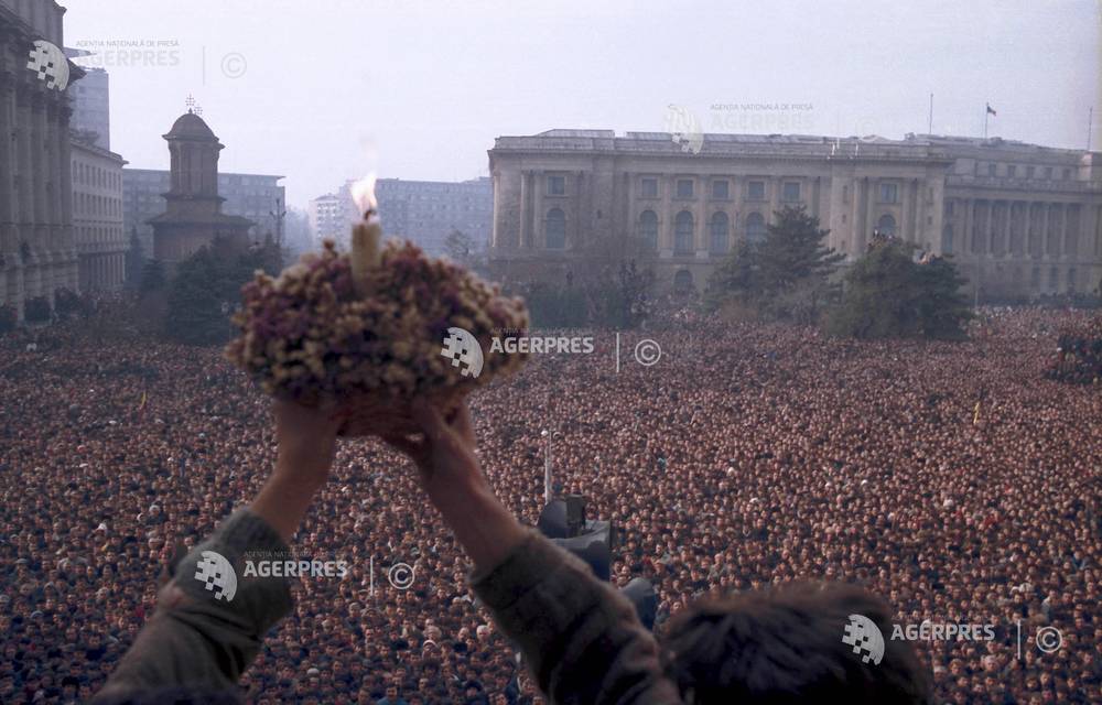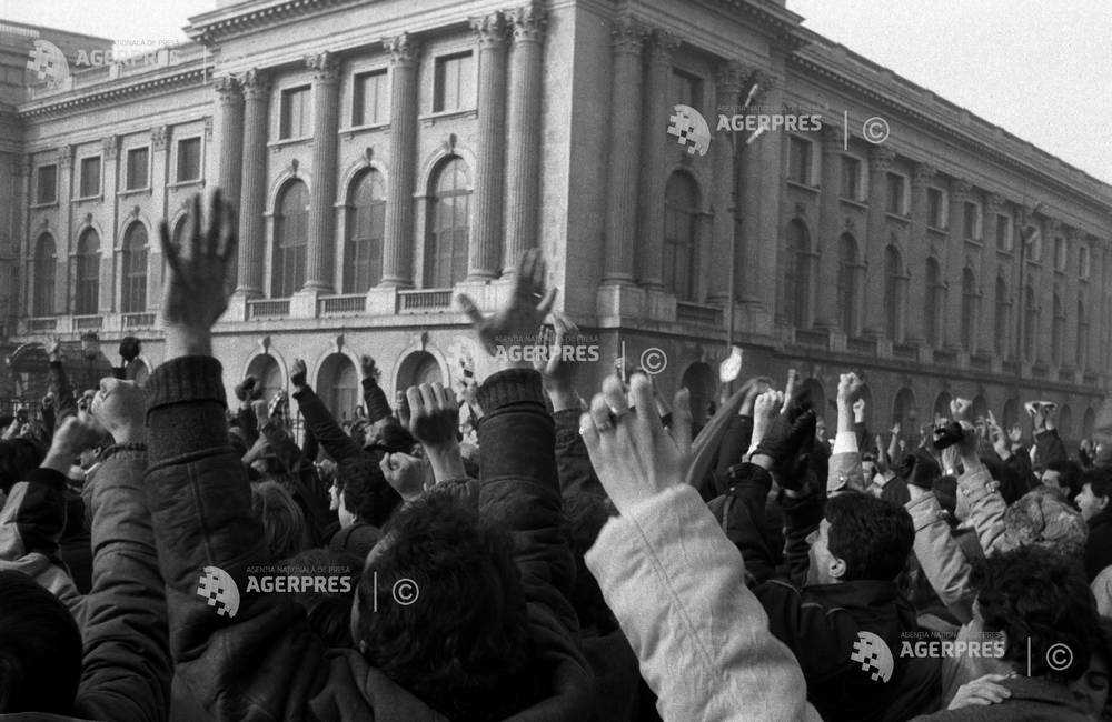 21 decembrie – În Piaţa Republicii din Bucureşti se desfăşoară un mare miting, în cadrul căruia, pentru prima dată în 24 de ani, de când Ceauşescu era la conducerea partidului, acesta este huiduit în timpul unui discurs. La sediul Comitetului Central al PCR, se desfăşoară şedinţa Comitetului Politic Executiv, în cadrul căreia se discută situaţia de la Timişoara; Nicolae Ceauşescu propune mărirea unor retribuţii şi ajutoare sociale. În jurul orei 12.00, începe în Piaţa Republicii un mare miting. Participanţilor le sunt distribuite un număr impresionant de pancarte prin care erau condamnate manifestaţiile de la Timişoara şi se exprima solidaritatea cu conducerea de partid şi de stat, în frunte cu Nicolae Ceauşescu. Desfăşurarea mitingului este transmisă în direct de televiziune şi radio. Cuvântarea lui Nicolae Ceauşescu este întreruptă de grupuri de protestatari. Se aud huiduieli; se creează panică, iar cea mai mare parte a manifestanţilor părăsesc mitingul; Elena Ceauşescu face încercări disperate pentru a-i linişti pe participanţi. Panica se generalizează, iar Nicolae Ceauşescu părăseşte microfonul şi balconul de la care vorbea. Transmisia mitingului la radio şi televiziune este întreruptă. După câteva momente, Nicolae Ceauşescu reapare în balconul Comitetului Central şi reîncepe cuvântarea; transmisiile de televiziune şi radio se reiau. Nicolae Ceauşescu promite, vorbind unei adunări constituită ad-hoc din trupe de securitate şi de ordine grupate în faţa balconului, luarea unor măsuri de îmbunătăţire a nivelului de trai şi protecţie socială. Mitingul din Piaţa Republicii se sparge, iar pe străzile din jur mii de oameni manifestează pentru democraţie şi împotriva dictaturii. Se aud lozincile: “Democraţie !”, “Libertate!”, “Ieri în Timişoara, azi în toată ţara!”, “Jos Ceauşescu!”. La ora 14, în centrul oraşului apar primele blindate şi autoamfibii. La ora 18.00, Ceauşescu organizează o teleconferinţă, în cadrul căreia susţine că acţiunile populare pun în pericol integritatea şi independenţa României. În cursul serii, demonstranţii, majoritatea tineri, se concentrează în faţa hotelului Intercontinental, unde ridică o baricadă în faţa dispozitivului de intervenţie. Forţele de ordine primesc ordinul să “cureţe zona”. În cursul nopţii, se trage asupra demonstranţilor de la ”Intercontinental” şi din Piaţa Universităţii; cad morţi şi răniţi. Numeroşi manifestanţi, majoritatea tineri, sunt arestaţi şi încarceraţi la închisoarea Jilava, din apropierea Bucureştilor. După ce manifestanţii sunt alungaţi, unităţi de salubrizare spală asfaltul de sânge.