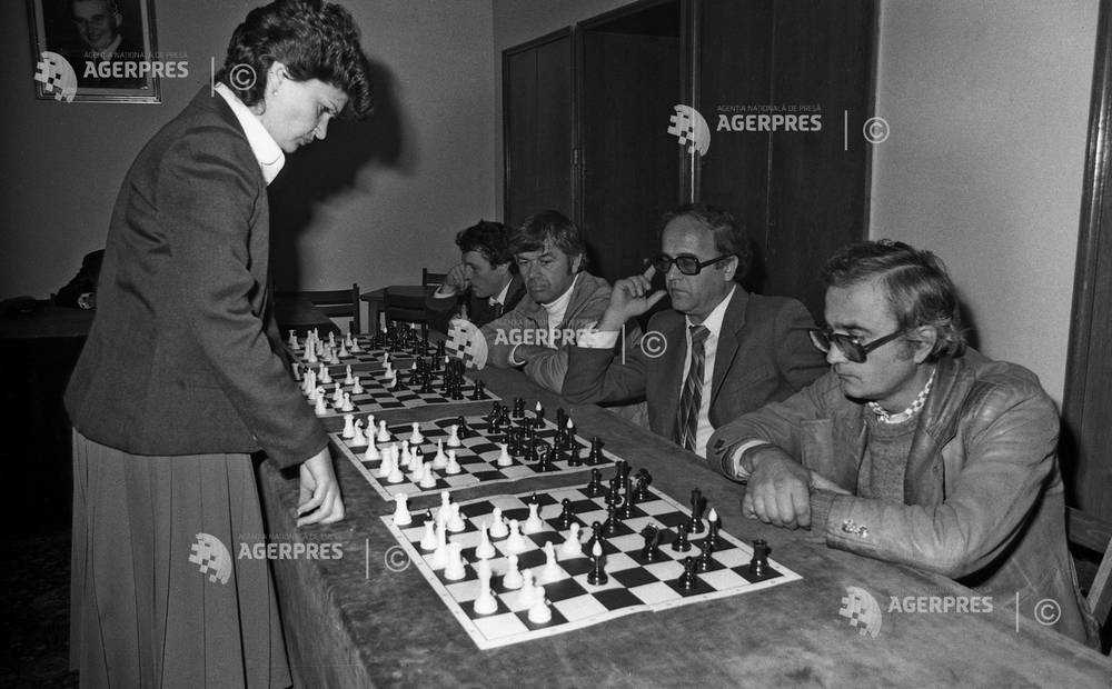 Simultan de şah la Agenţia Română de Presă AGERPRES cu participarea maestrului de şah Margareta Mureşan (stg.). 1984