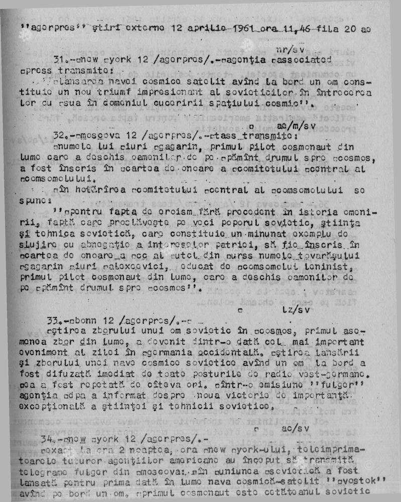Ştiri externe din arhiva AGERPRES: la 12 aprilie 1961, nava spaţială Vostok a efectuat primul zbor în cosmos. La bordul său s-a aflat, pentru prima oară, un om: cosmonautul Iuri A. Gagarin.